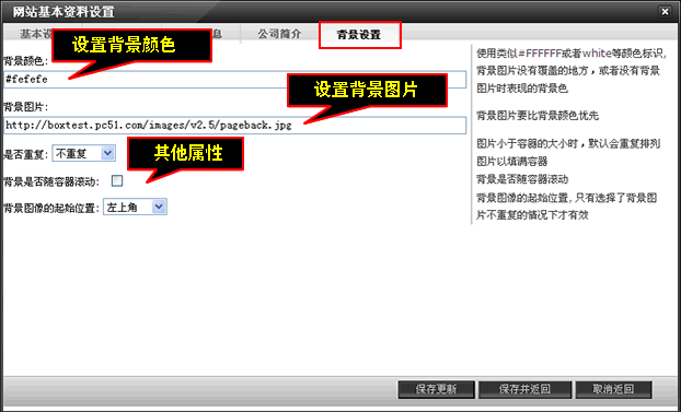背景图片:直接输入背景地址就可以显示出背景图片:例如输入http://boxtest.pc51.com/images/v2.5/pageback.jpg ,可以设置图片是否重复、滚动以及起始位置。